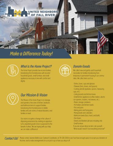 Located in Fall River, the United Neighbors Housing Project is a non-profit organization that manages and operates a free store with recycled household goods, small furniture, and small appliances supporting victims of natural disasters, families in need, and individuals transitioning from homelessness.